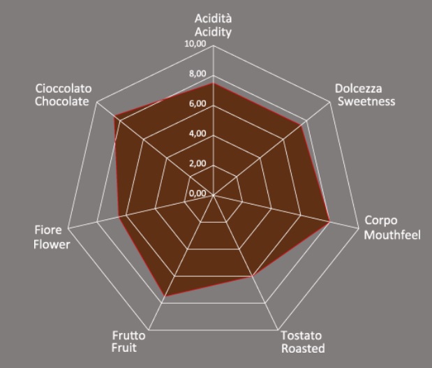 Состоит из натурального и мытого кофе. Ярко проявляются оттенки шоколада, спелых фруктов, зеленого грецкого ореха, сухофруктов и цитрусовых.