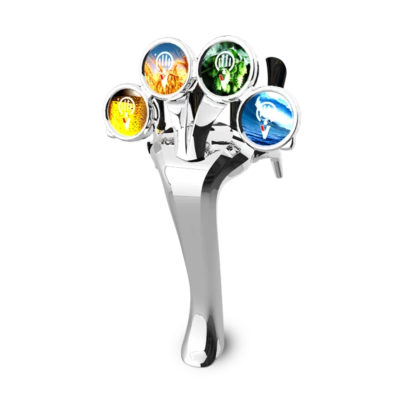 Башня для разливного пива с корпусом из хромированной или позолоченной латуни. Поставляется с 1-3 кранами и настраиваемыми медальонами со светодиодной подсветкой.